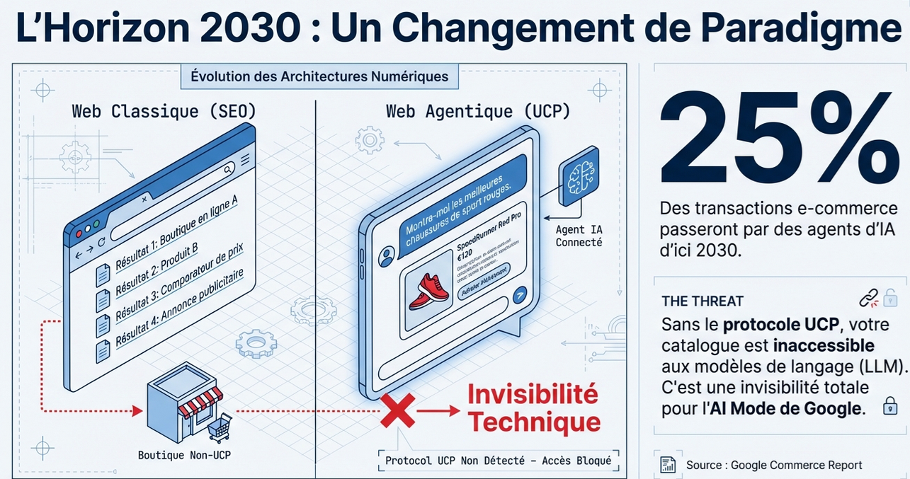 L'annonce du déploiement du paiement UCP (Universal Commerce Protocol) dans l'AI Mode de Google n'est pas qu'une simple évolution fonctionnelle. C'est un changement de paradigme qui impose aux e-commerçants une transformation technique profonde de leur infrastructure. D'ici 2030, les transactions via agents d'IA pourraient représenter 15 à 25 % du commerce électronique américain [source Google].