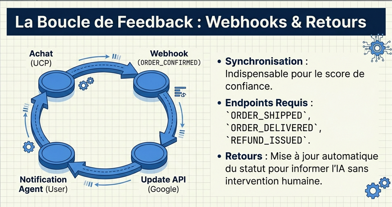 }L'UCP exige une fidélité d'inventaire élevée. Les agents d'IA traquent les "échecs delta" : si un agent promet un produit en stock et que la commande échoue, votre score de confiance (ATS – Agentic Trust Score) diminue.